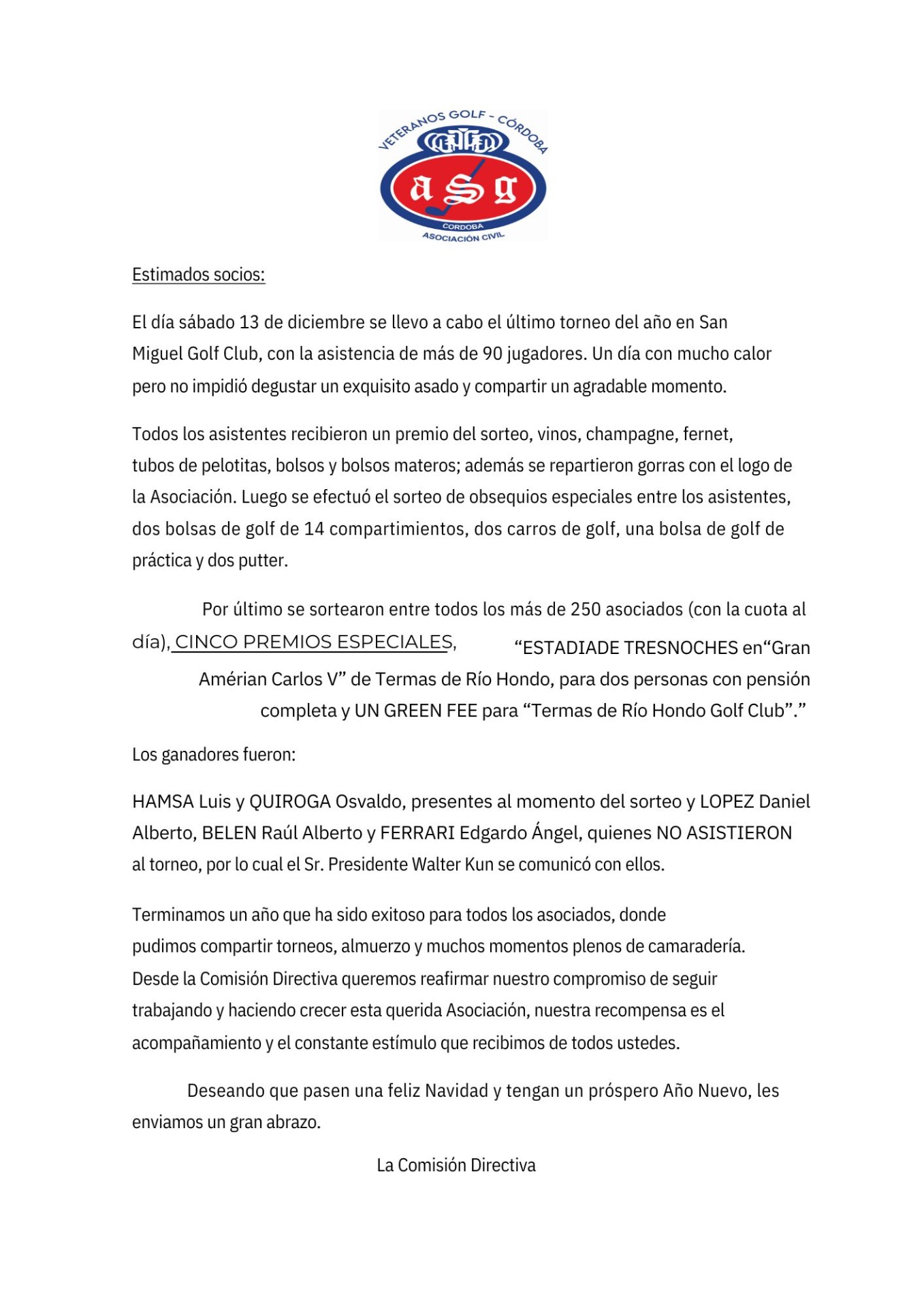 La Comisión Directiva ha resuelto efectuar un SORTEO de FIN de AÑO, para agasajar a nuestros socios y como forma para incentivar su participación en los Torneos de la Asociación... leer más...